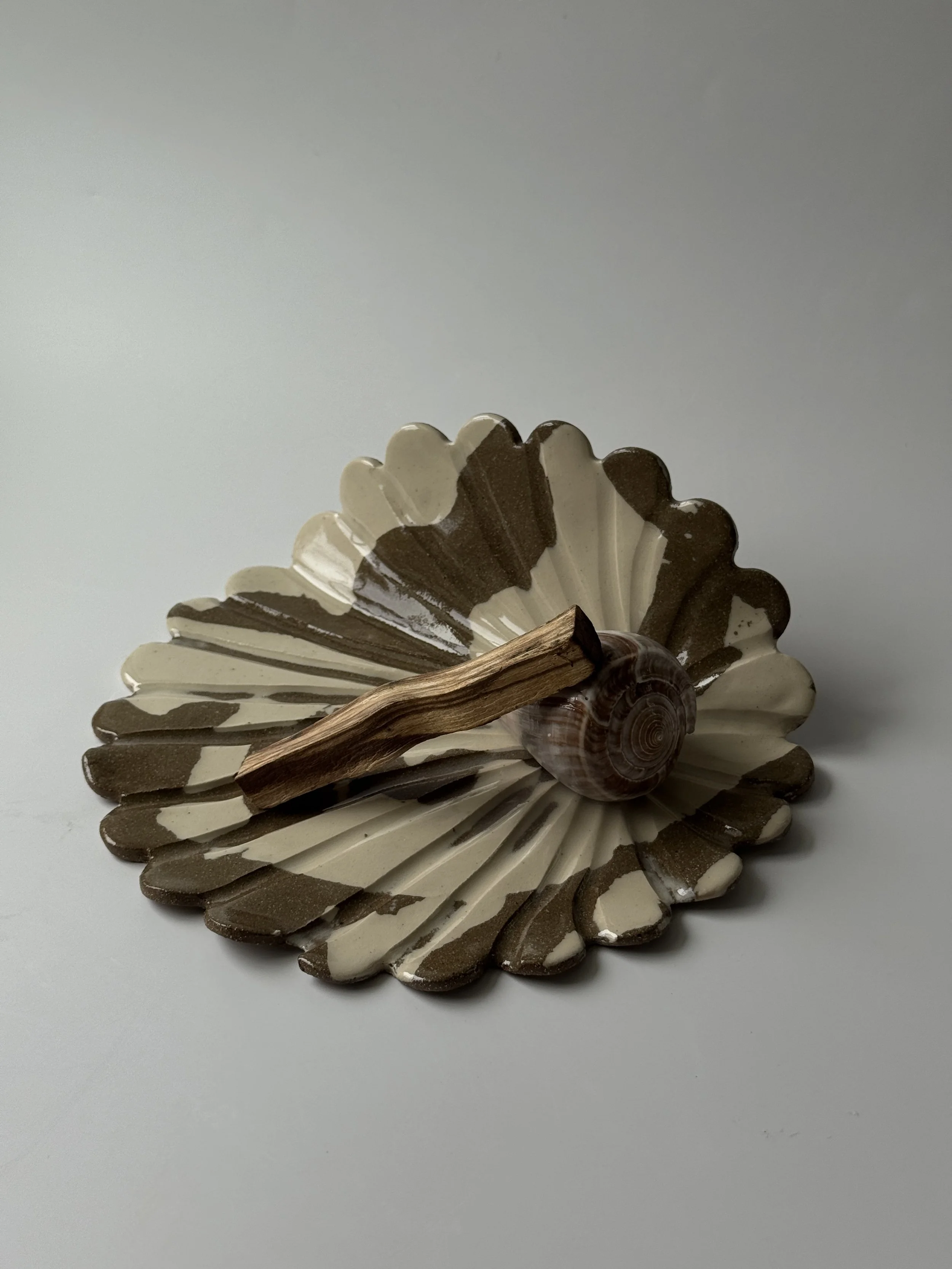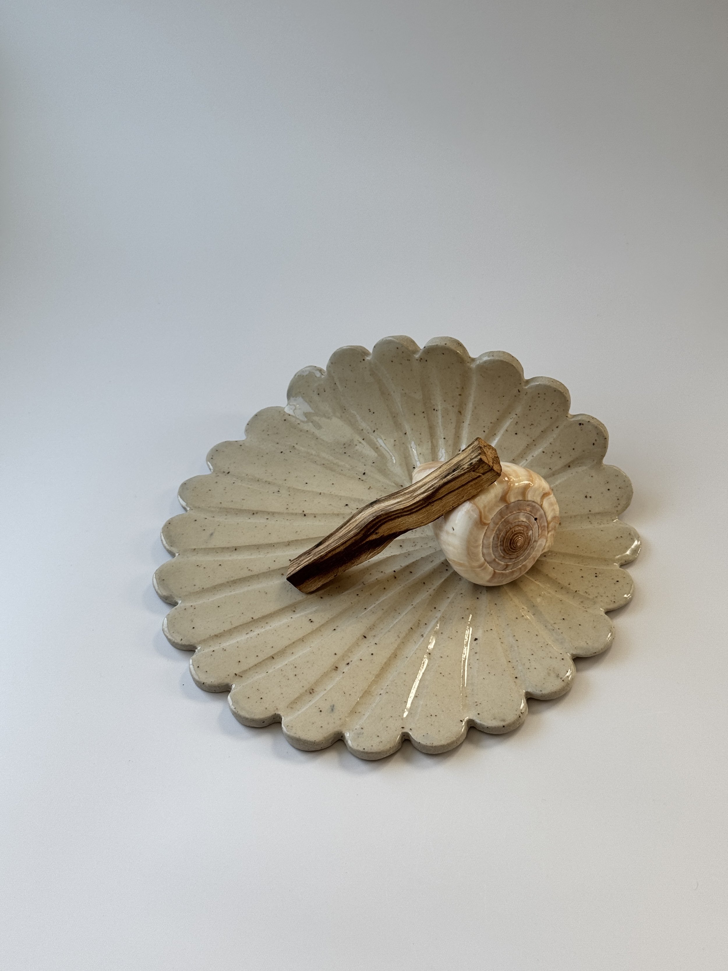 Brit, the artist behind these plates, grew up on Kiawah Island, South Carolina, where she would gather shells from the beach just below her home. That practice of collecting — of listening to what the tide offered — shaped the way she sees and makes. Today, her work carries both those memories and the textures of shells gathered from California shores, extending her ritual across coasts. Each plate is hand-formed in stoneware, created to cradle Palo Santo and to hold a moment of pause. We chose them because they carry a shoreline quality — imperfect, grounding, and shaped by both hand and place. Each one carries its own tide, its own quiet story.