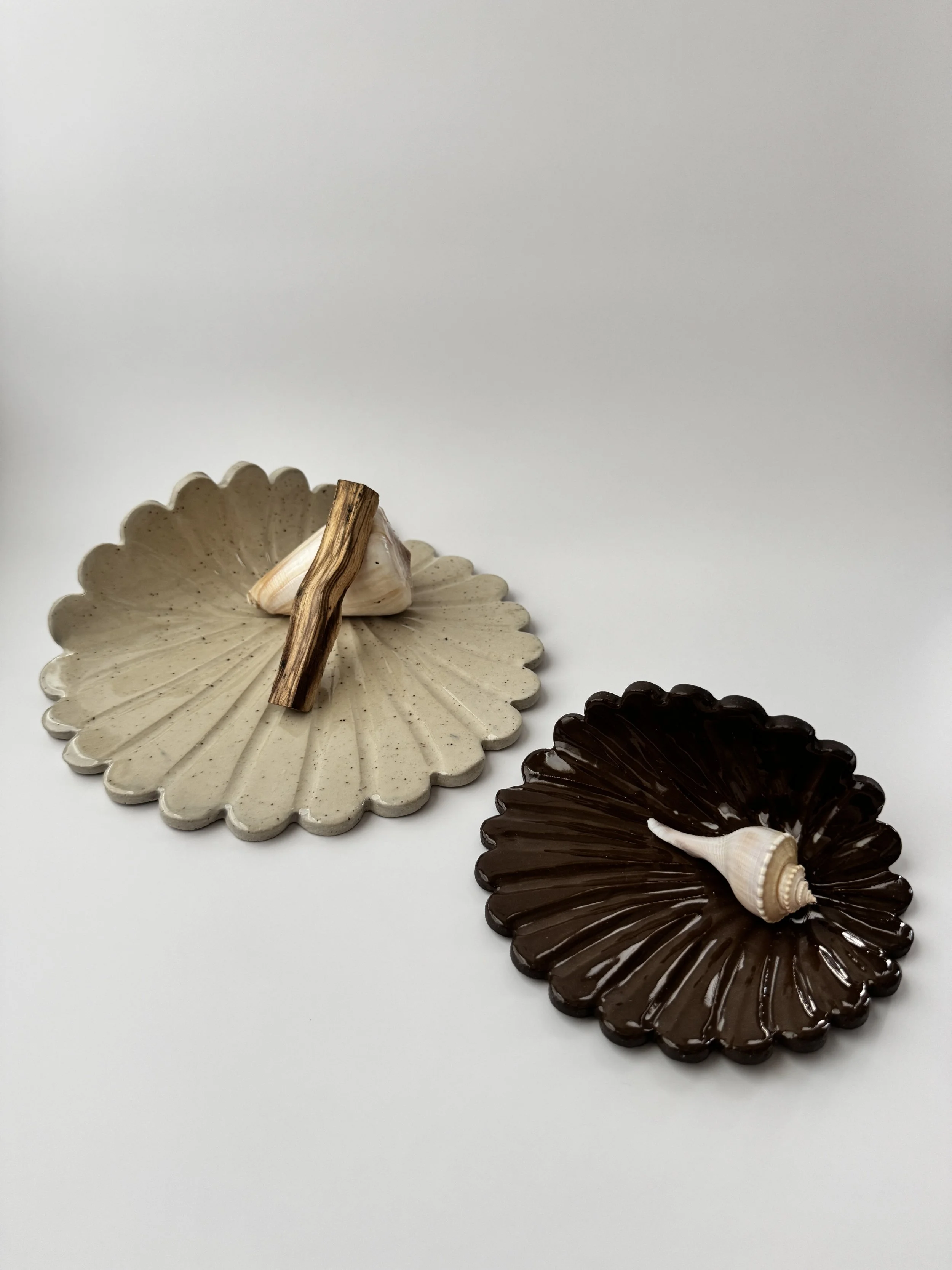 Handmade stoneware, created in South Carolina with seashell impressions from the California coast.