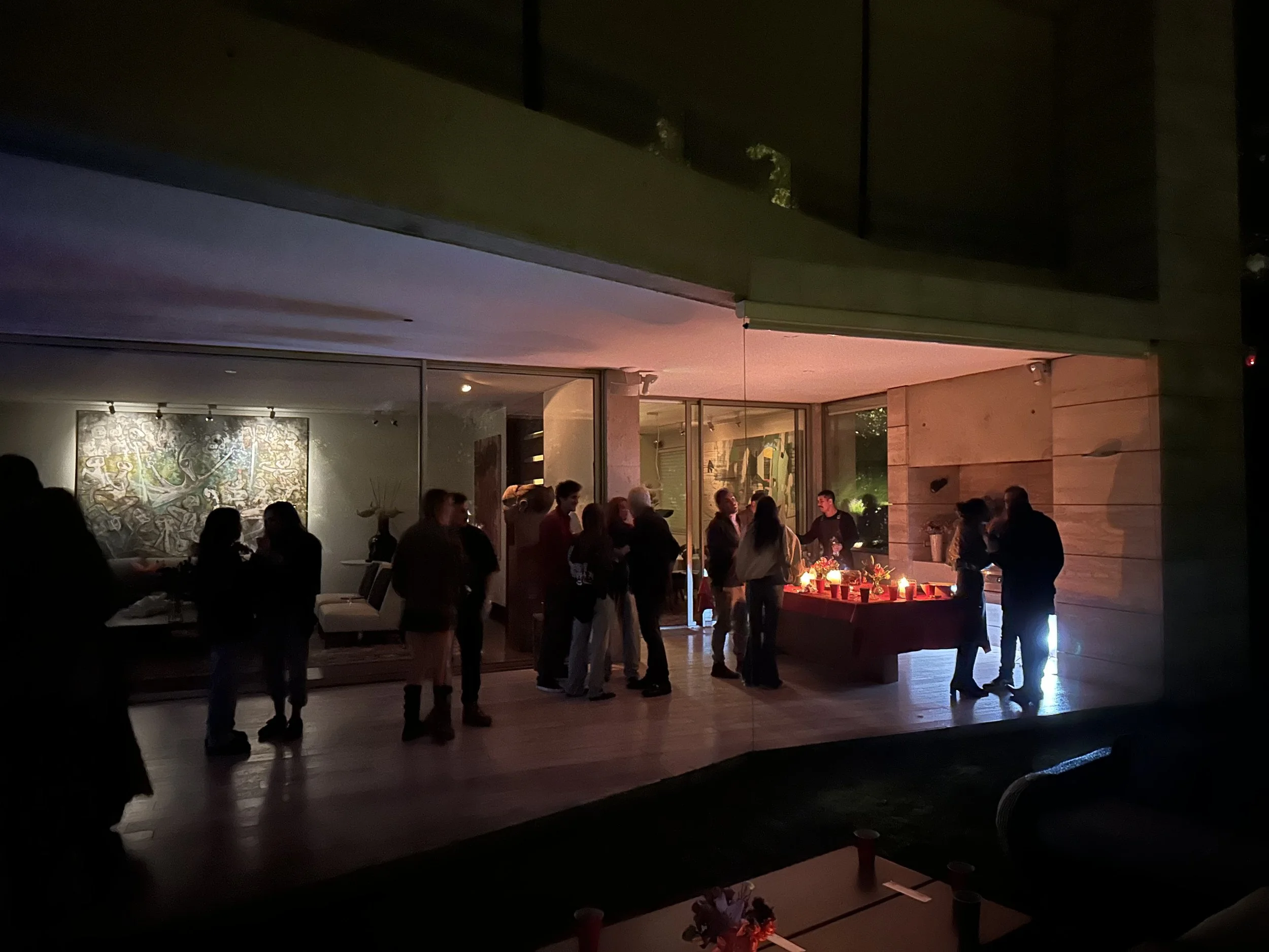 People gather at a nighttime social event with a buffet table illuminated by candles inside a modern house with floor-to-ceiling glass walls.