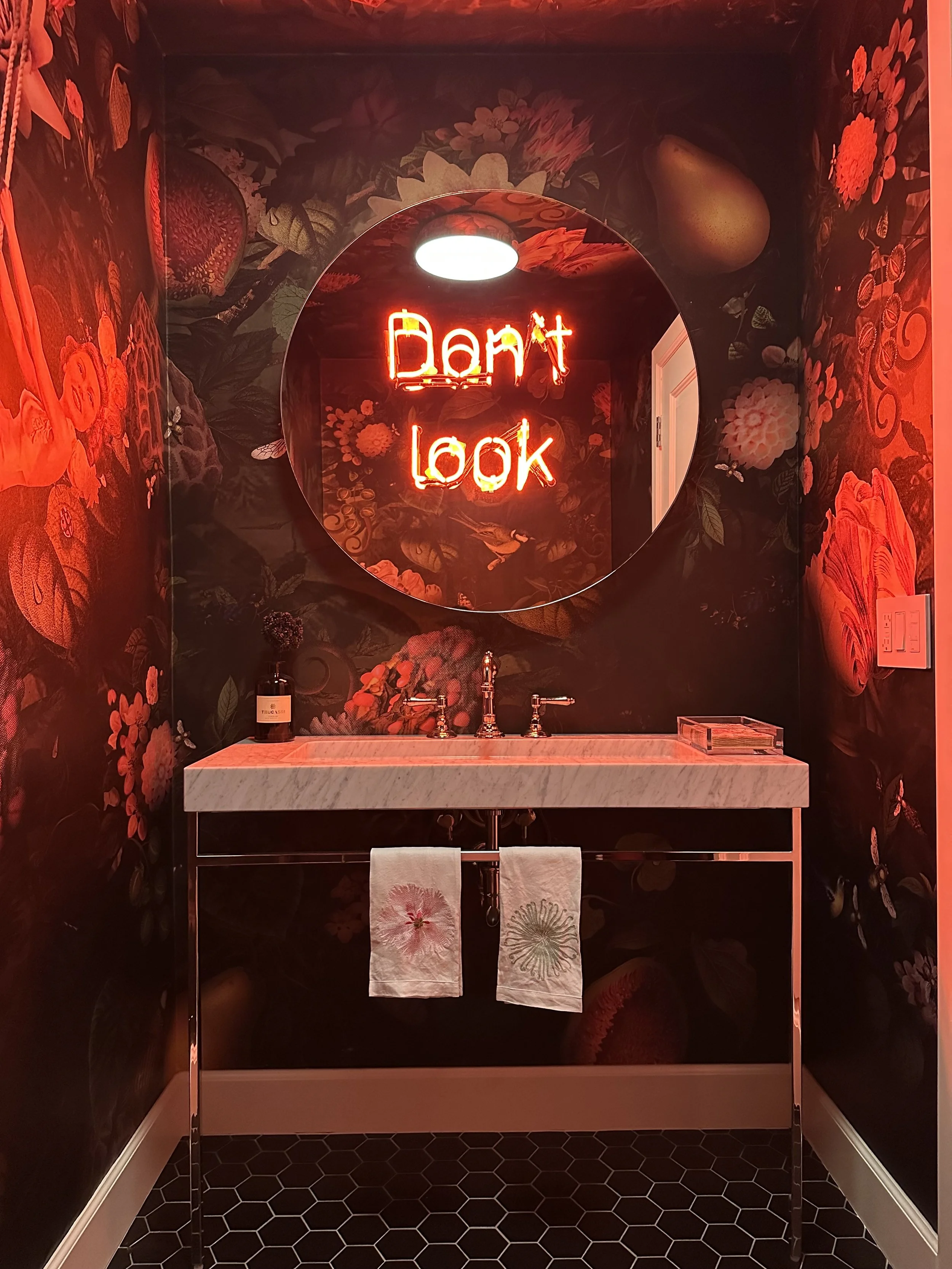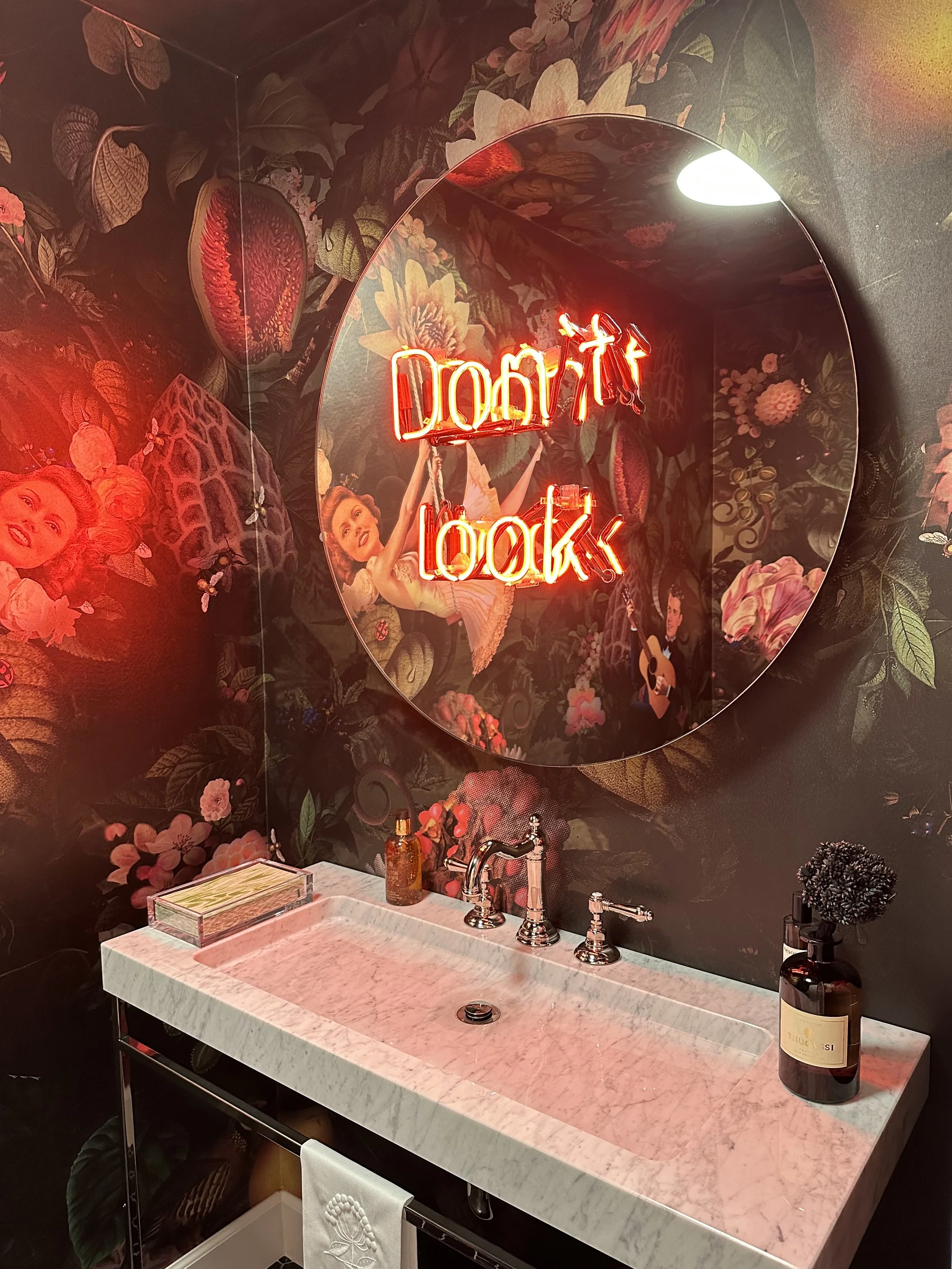 A bathroom with a rectangular marble sink, a neon sign that says 'Don't look,' a decorative floral wallpaper, and a round mirror. There are bottles and a flower arrangement on the sink.