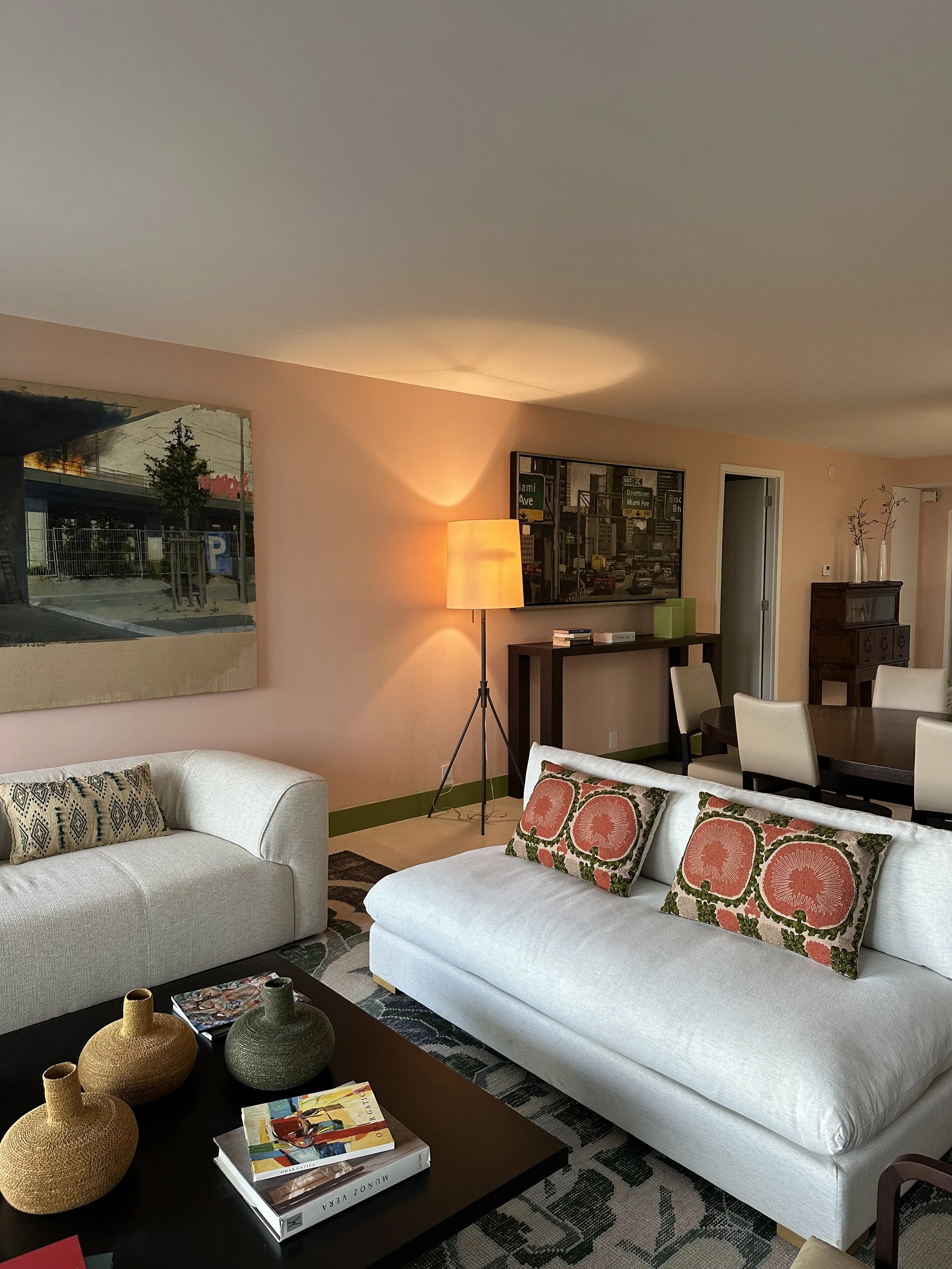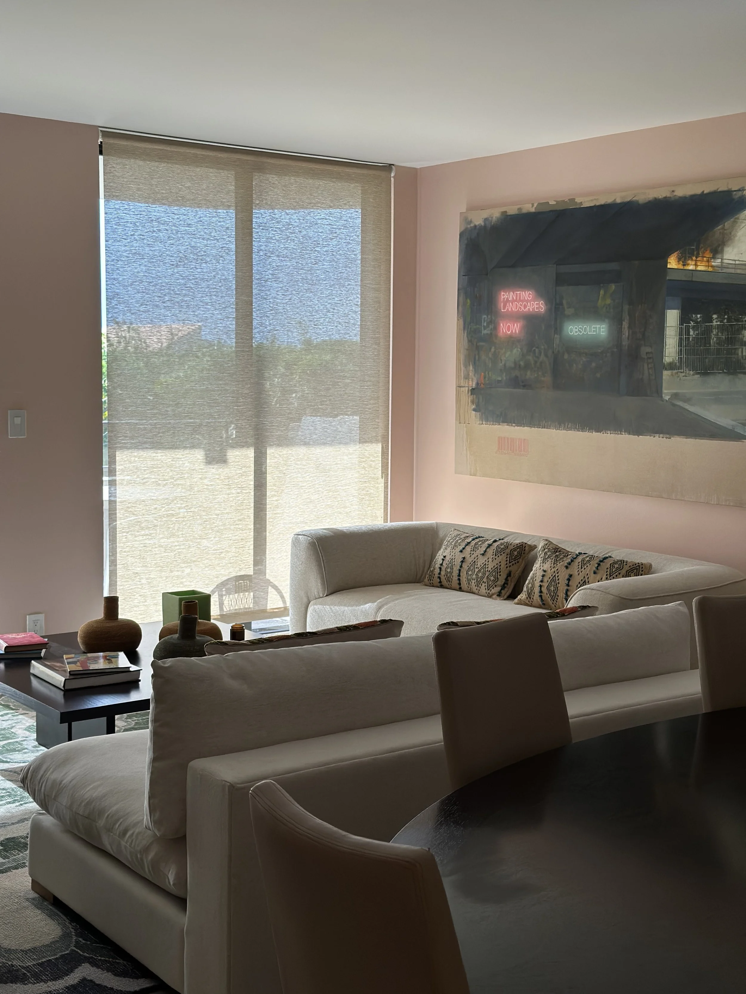 Modern living room with pink walls, beige sofas, and a large abstract painting. There is a table with decorative vases, a large window with closed blinds, and a wall art with neon signs that say 'Painting Landscapes Now' and 'Obsolete.'