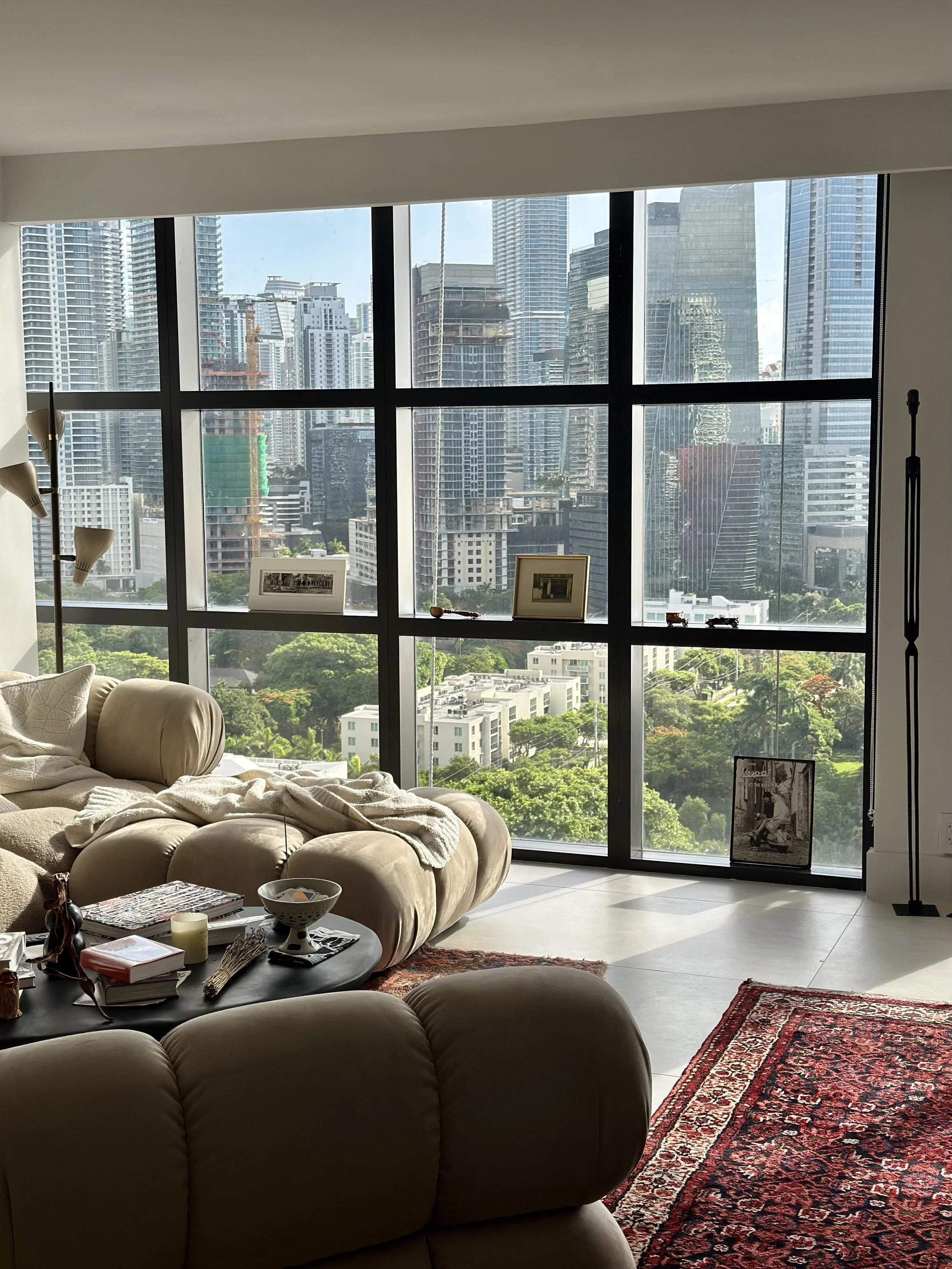 Living room with large windows overlooking a city skyline with tall buildings and a green park area below. The room has beige couches, a black coffee table with books and decor, a red patterned rug, a standing lamp, and framed photos on the window le