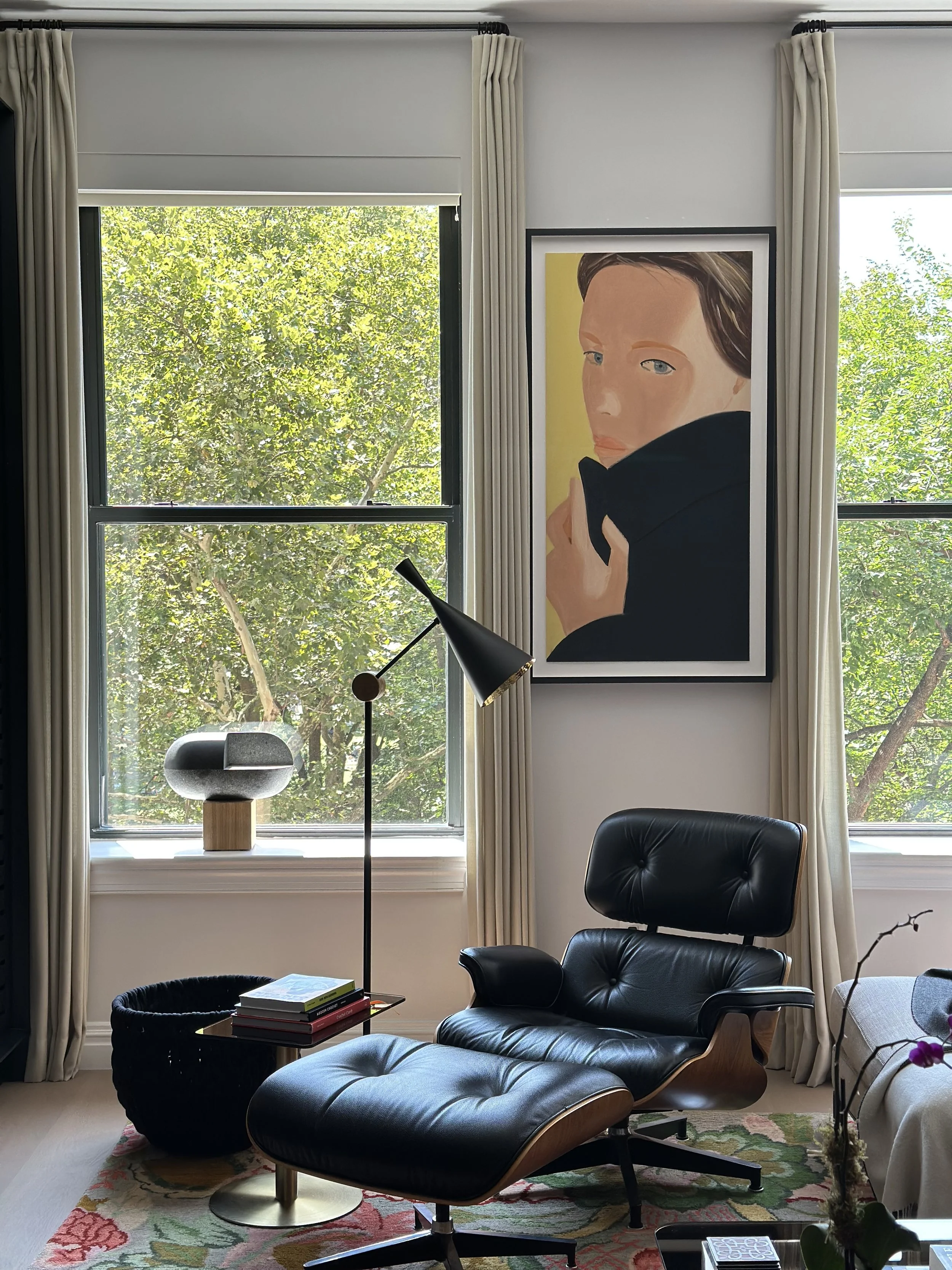 A cozy living room with two large windows showing green trees outside. A framed portrait of a woman with short hair, holding a coat collar, hangs between the windows. A black leather lounge chair with a matching ottoman is in front. A side table with