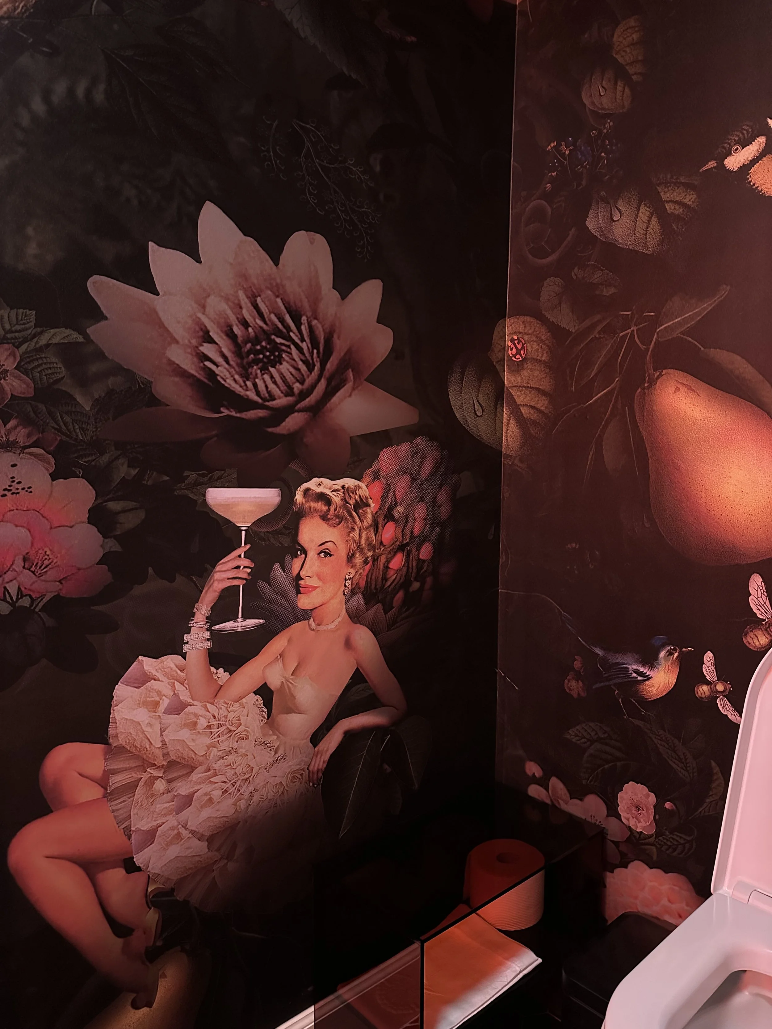 A decorated bathroom wall featuring large floral patterns and a vintage-style woman holding a cocktail glass. The wall art includes detailed images of flowers, a pear, a bird, and insects, with a dark background and warm lighting.