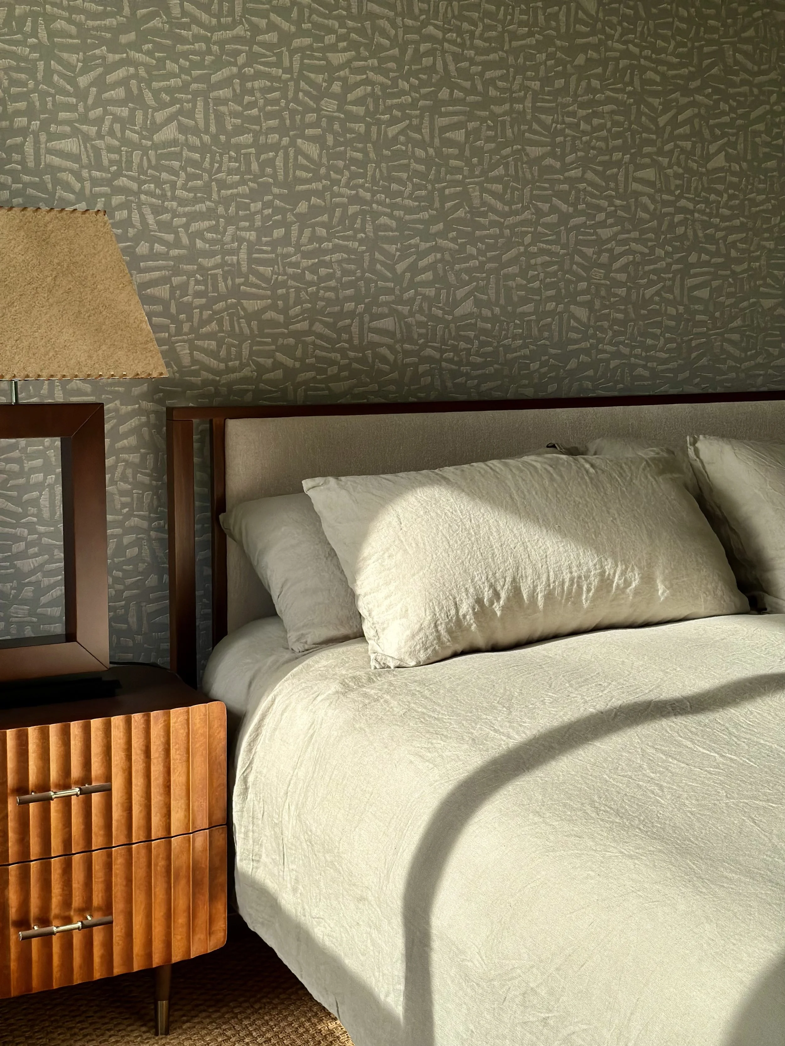 A bedroom scene featuring a bed with cream-colored bedding and pillows, a wooden side table with horizontal handles, a lamp, and a textured gray wall in the background.