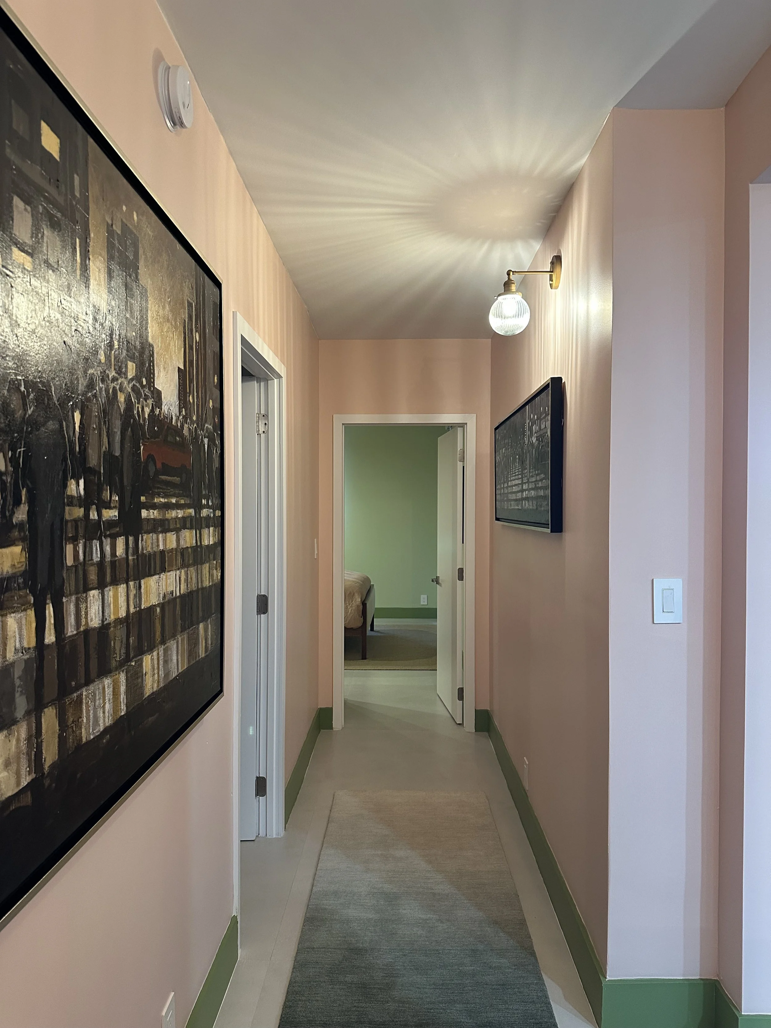 A hallway with peach-colored walls, green baseboards, and artwork on both sides. There's a ceiling light casting a glow and a door at the end leading to a room with green walls and a bed.