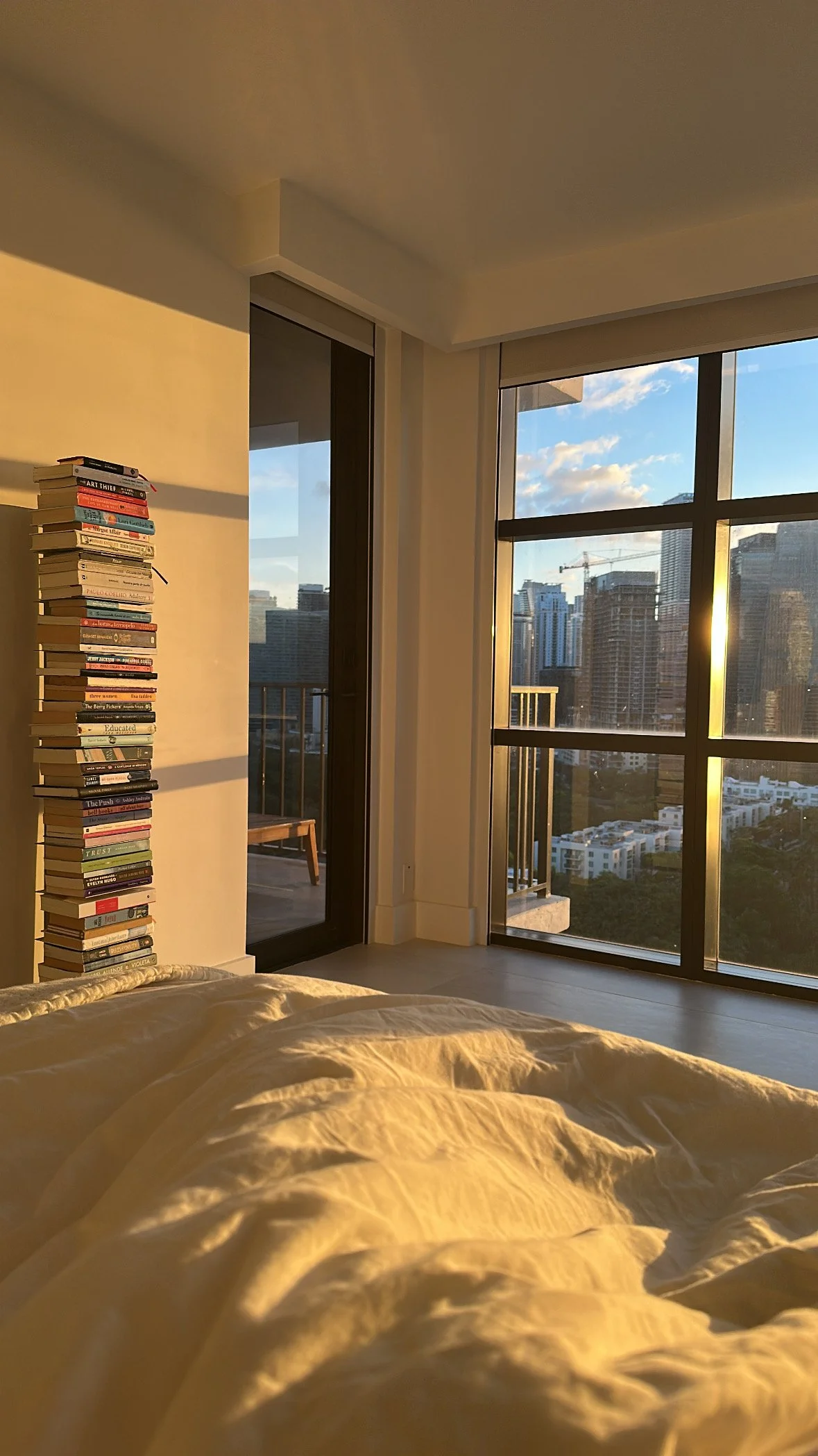 A modern bedroom with a large window showing a city skyline at sunset, a stack of books next to the bed, and a balcony.