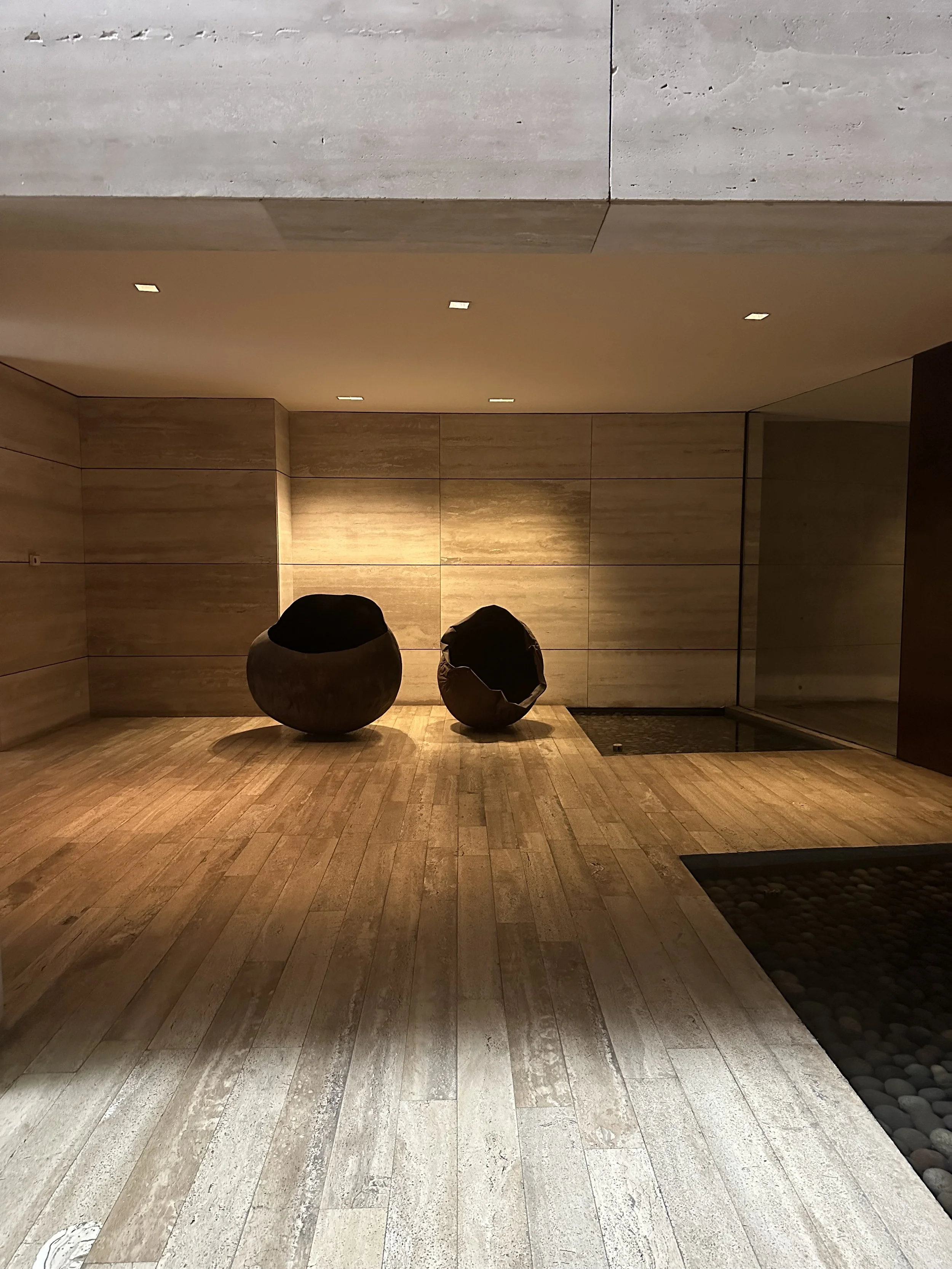 Interior of a living room with dark wood wall unit, decorative sculptures, a mirror, a beige sofa with patterned pillows, a wooden chair, a small black side table, and various decorative objects and books.