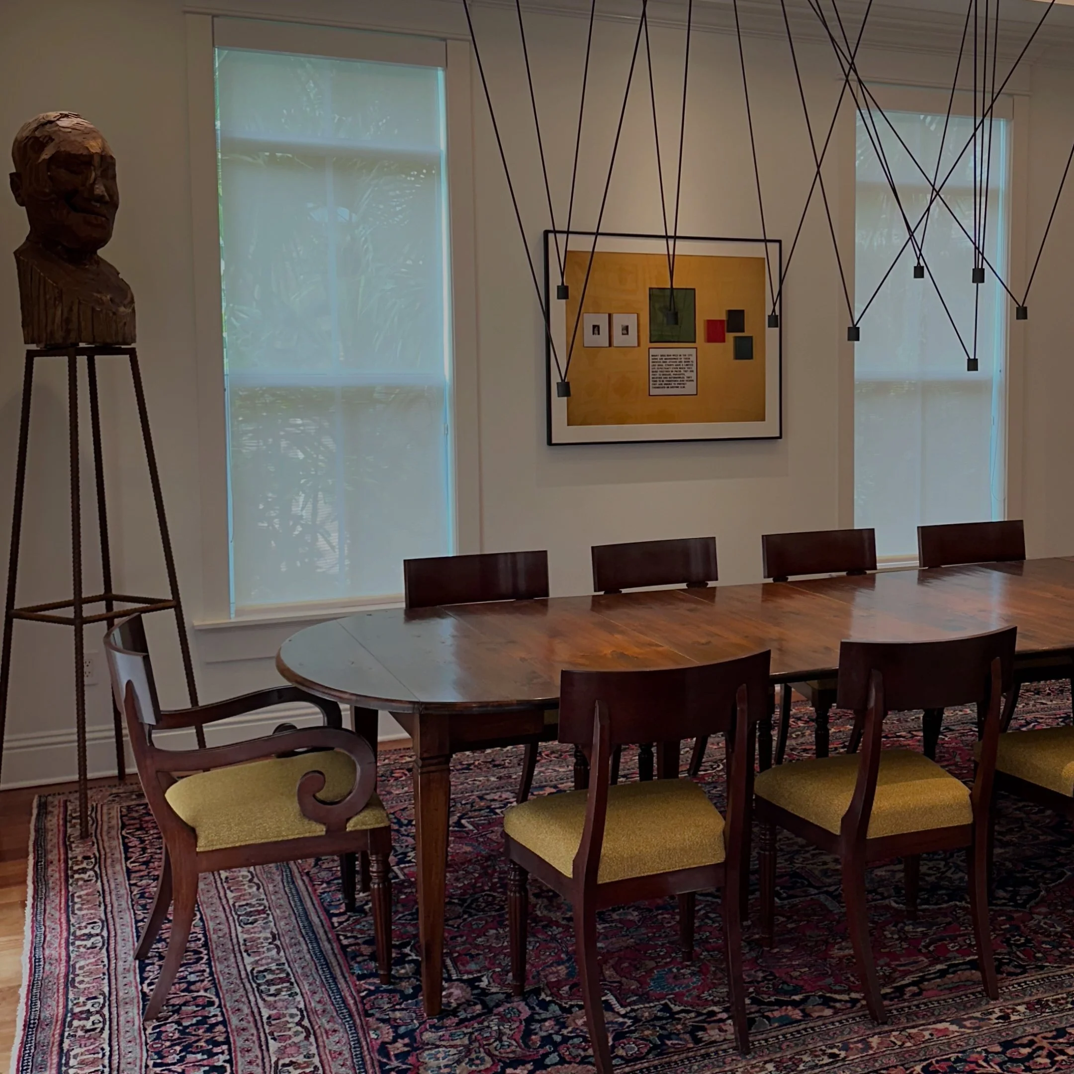 A dining room with a large wooden oval table and six chairs with yellow upholstery and dark wood frames. There is a colorful abstract artwork and black string art on the white wall, with two windows allowing natural light. A carved wooden bust is on