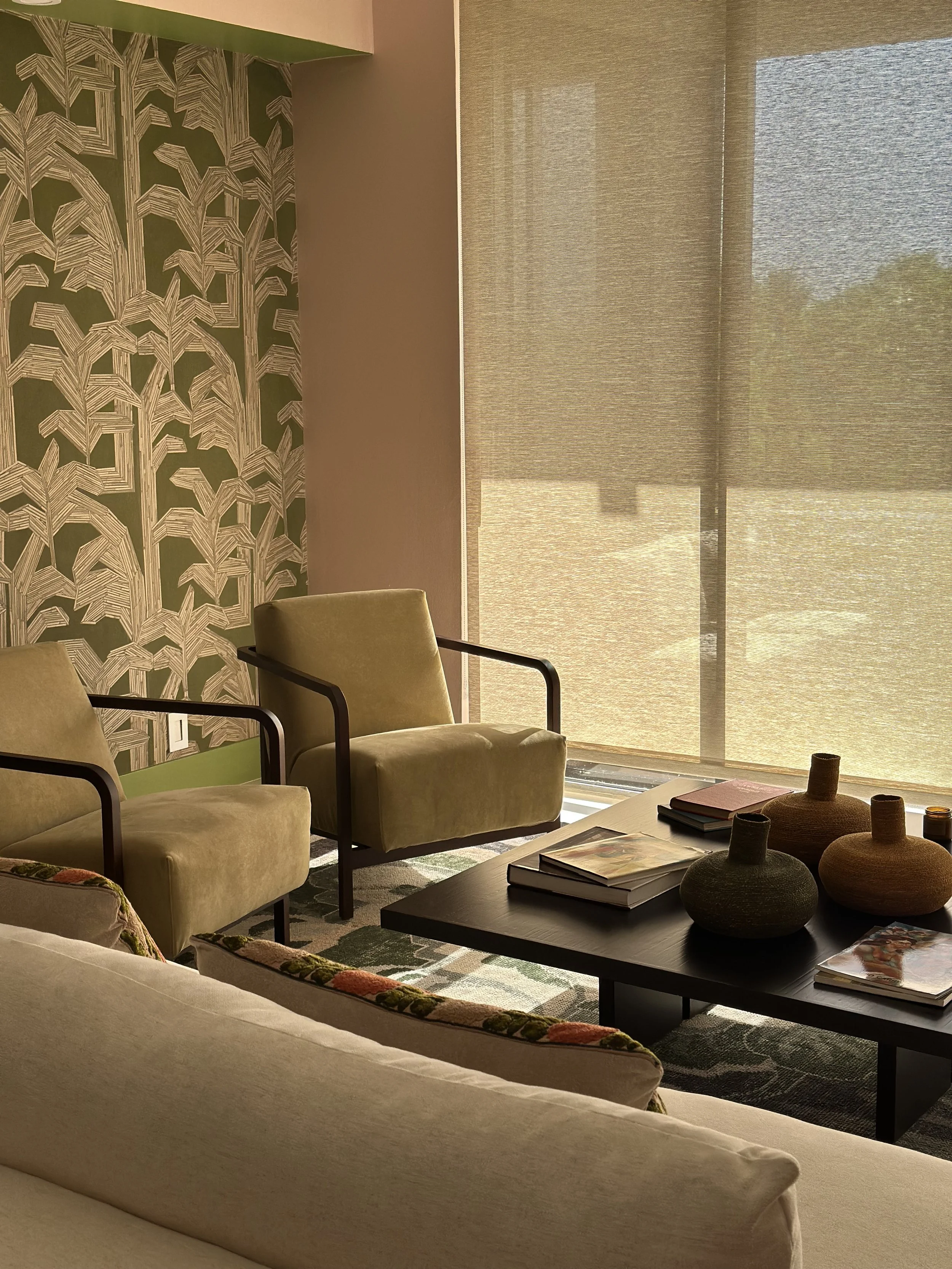 A cozy seating area with pairs of beige armchairs and a white sofa, a coffee table with decorative pottery and books, and a large window covered with a beige roller shade, allowing warm sunlight to fill the space.