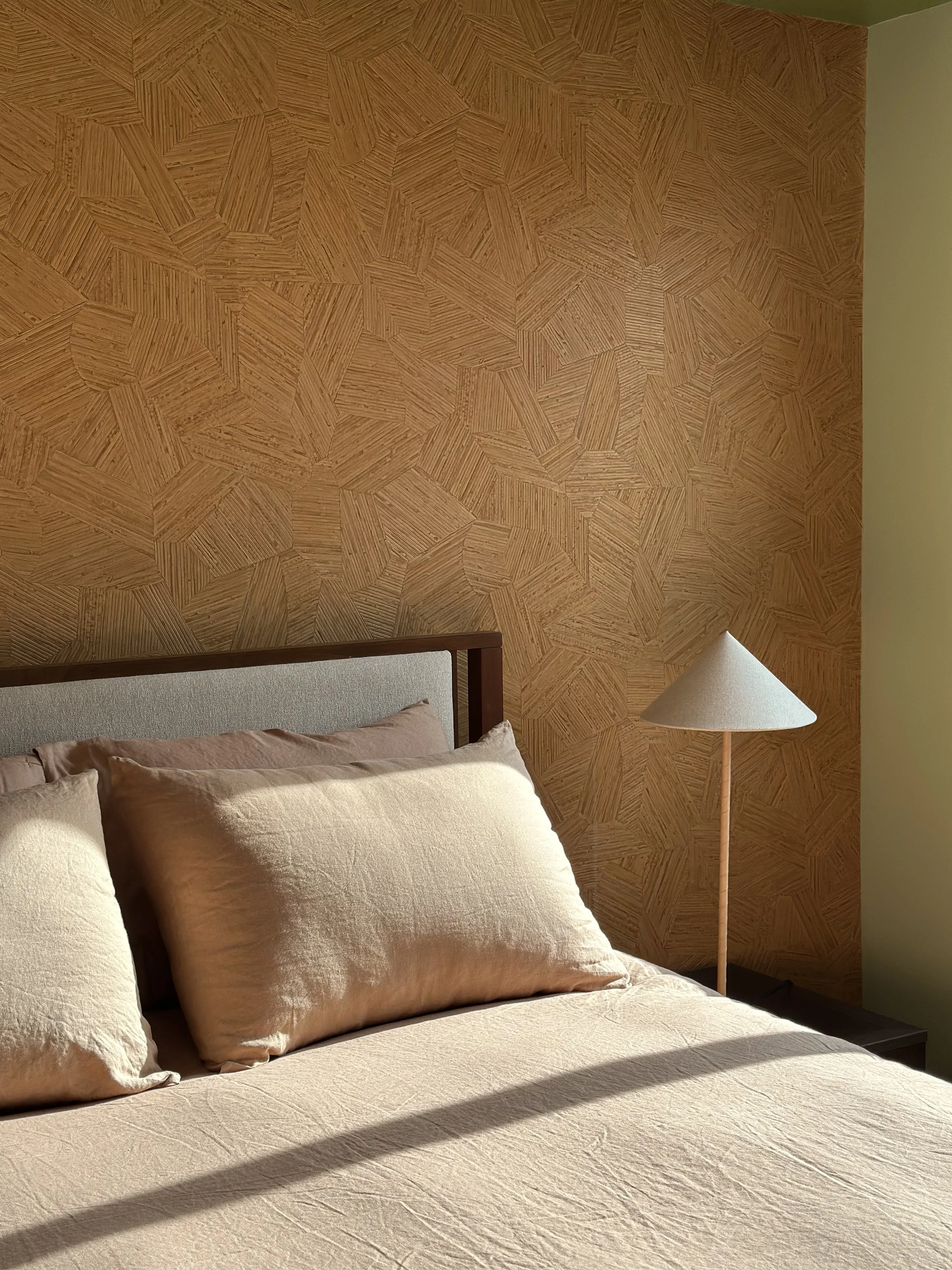 A neatly made bed with beige pillows, a beige bedspread, and a simple wooden headboard. There is a wooden floor lamp with a beige lampshade beside the bed. The background features a textured wooden-patterned wall and a small portion of a light green