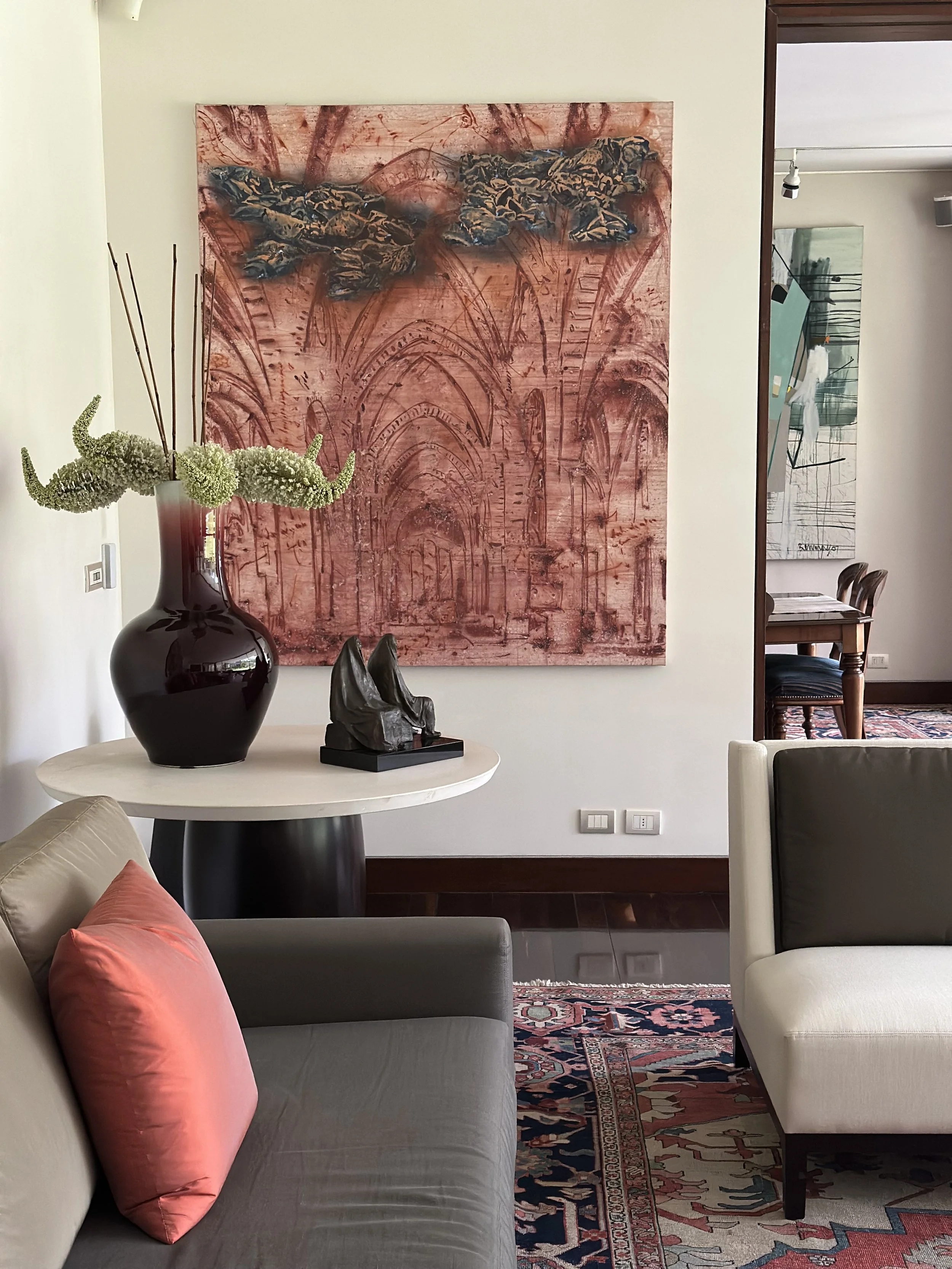 Living room with modern decor, featuring a large colorful abstract painting on the wall, a beige sofa with coral cushions, a dark wood coffee table with vases of pink flowers, a gray armchair, and artwork on the walls. There is a patterned area rug a